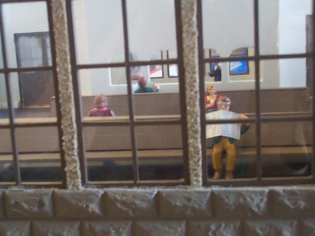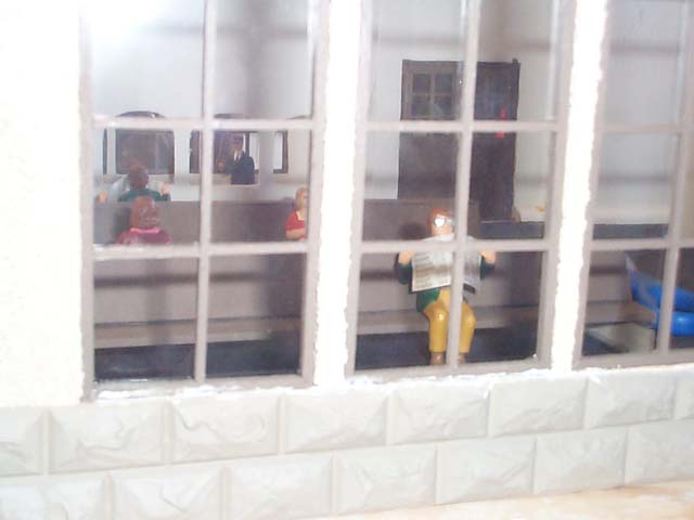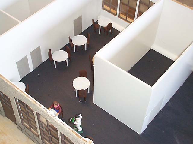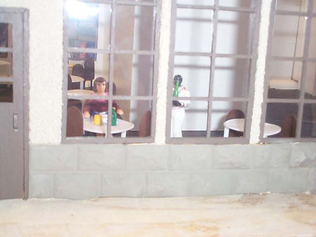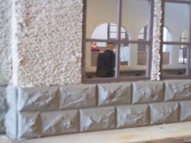 Here is one stage of the project. The board that it sits on is about 6 feet long. The walls were made out of plywood. I cut them all at my house and assembled them and then took it to school. This was because we could not use power tools there. It was a thing where the principal was afraid of a lawsuit. Most of the work was still done in class. Here are some pictures through the windows. I had to build all the windows from basswood . To make the arch at the top of the windows, I soaked the wood in water and then clamped the wood while glued. There is 4 pieces of wood in the frame, and 7 pieces in the crossbars. Did I mention there is 21 windows? There is also 5 doors with 3 pieces to frame each. That makes a total of 246 pieces I had to cut and sand to make perfect. The stone on the outside is vacuum formed plastic from Applied Imagination Inc. I painted it with ultra flat camouflage tan paint. It almost looks sandy. To do the stucco, I covered all of the windows in masking tape, then cut with a razor blade the arches. The stucco helped to fill in any gaps from cutting I did. The stucco was left-over from the outside of my house, and took about a gallons worth to do all of it. It takes about a day to fully dry, but I removed the tape while it was still wet. I also decided to do a full interior on the station. The benches I made from balsa to look like the ones here in Denver Union Station. I looked all over for chairs that were the right size and looked like they belonged in a restaurant. I wound up making them myself from some cedar shakes for doll houses that had rounded tops and bamboo skewers cut up for legs. The tables were from my high school cafeteria. My brother helped run it, and he got them from the pizza boxes. They keep the lid off of the toppings. Free tables!! He actually brought about 100 home, I only needed 9. I will find another project for the rest. Here is a picture of the finished model. For the roof I decided I wanted slate and copper. The slate is from Applied Imagination Inc. as vacumed formed plastic, but I had to paint it. To get it to look right, I used a 4 step painting process. I first painted it in a green camouflage paint. It comes in ultra flat. Then I put a watered down black paint on it and wiped it off. I then did it again with it less diluted. Last I put another watered down layer and let it sit in the grooves of the plastic. After a couple minutes, I wiped it off. It really looks like slate. The copper was quite easy to do. This is because my dad owns a sheet metal shop, and he had all the equipment. I made gutters and all. I built overhangs above the doors which were also copper. I then did detail work and I was done. My estimate is that I spent over 200 hours on the drawings and building of the station. |