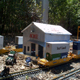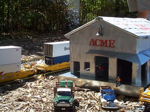Warehouse This was the first building that we built. It is made entirely out of cement board and pop cans. We got the idea off the internet, and built ours a little larger. To build it we had to cut out the doors out of the cement board. This stuff is not easy to cut. We used a tool called a roto-zip. It worked well, but it throws dust everywhere. This is mostly because the bit is about a 1/4 inch wide. We then had to collect the pop cans. This is what makes the project take a while. This building took around 150 pop cans. We had all our friends at school giving us cans for the project. We then had to wash each and cut them open into a square. Next step was to run the cans through a Fiskars paper crimper. We have used this for many projects, and I would recommend it to anyone. You have to squeeze hard to get a good crimp, but it is cheap and looks good. We then liquid nailed the pieces to the cement board. We needed a base for it, so we built it down at my dads sheet metal shop. Last we wanted to name it. We chose ACME. We made a pattern on the computer, cut out the letters, and then had a template. We taped it to the cans on the building and used light coats of red paint. Last we aged it by running steel wool over the top. |