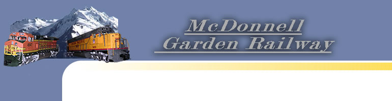 There will be no McDonnell Garden Railway Layout photos for Summer 2005. This is because we have done a MAJOR landscape project in the back yard. We have added a large fountain where the old pond was and removed the old waterfall. The train had to be removed in some spots during construction. The train will be run next year but remain torn apart for the winter.