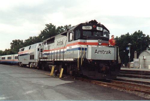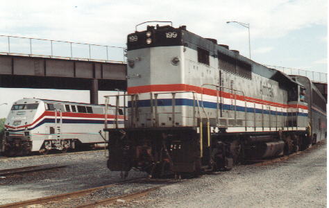 199 switching in RensselaerHeres GP40TC 199 in the Albany - Rensselaer yard switching a Superliner II Lounge. The Superliner II's were delivered to Albany and were then coupled onto the westbound Lake Shore Ltd and then shipped to Chicago during their arrival period. P40 815 is in the background. Photo: Bob LaMay, early - mid 1990's.