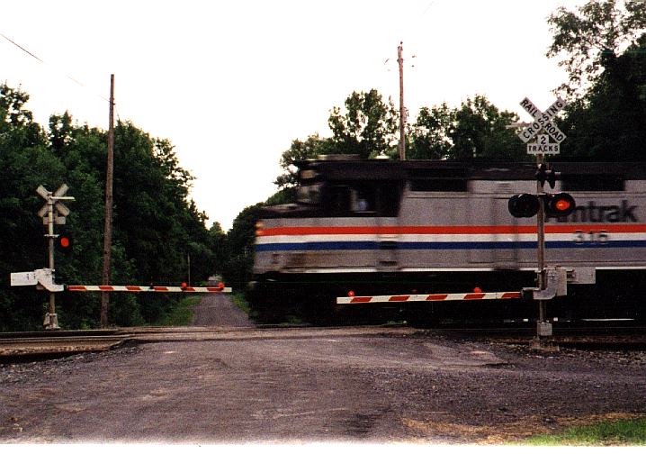 Here is F40 316 blasting through the crossing at Pump Road heading up the eastbound Maple Leaf - 1997.