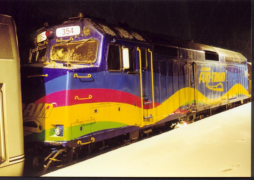 354 Fun Train F40 354 as the second unit on train 49, the Lake Shore Limited seen at the Syracuse, NY station in its Florida Fun Train colors. I took the photo on a late and COLD winter night in maybe 98 or 99?