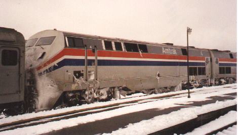 Snow-covered P42 #4 behind #6 on train 48/448 in Syracuse, NY, 3/98.