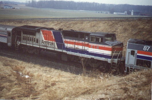 P32-8BWH P32-8BWH 518 seen in their original paint as the trailing unit on train 48/448, the Lake Shore Ltd. seen from the Oakland RD overpass in Weedsport, NY, circa 1998.