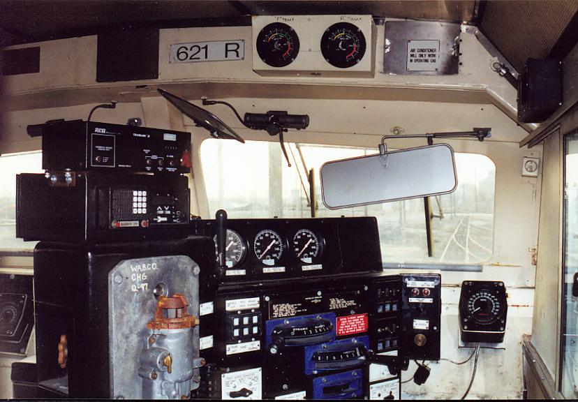 Cab of E60 621 The engineer's side of the cab in Amtrak E60 #621 in Wilmington, DE yard, Spring 1999. The controls are very similar to a F40.