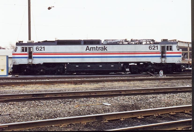 E60 621 A nice side shot of Amtrak E60 #621 in Wilmington, DE yard, Spring 1999. Gives you a look at how long these bad boys are.