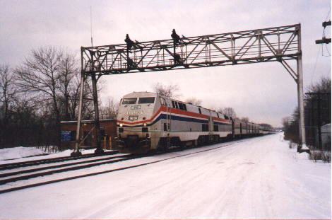 P42 90 and 16 lead the Lake Shore under the signal bridge at MP 313, 1/28/98.