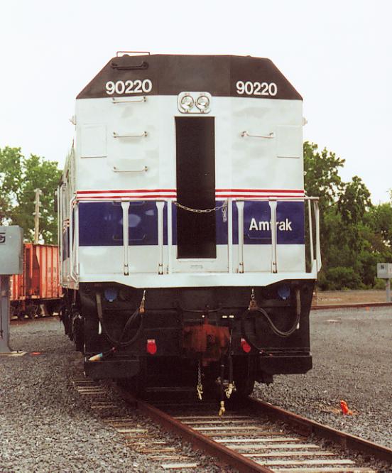 Cabbage 90220 rear Amtrak former F40, convereted into Cab control/Baggage unit AKA "Cabbage" cars, #90220's rear, in Albany/Rensselaer Summer 2000.