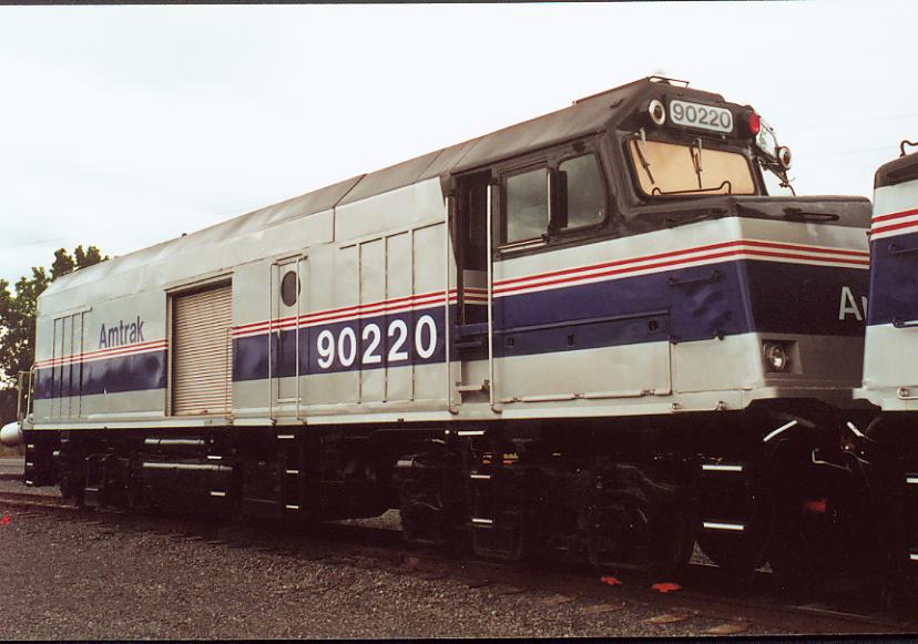 Amtrak former F40, convereted into Cab control/Baggage unit AKA "Cabbage" cars, #90220 in Albany/Rensselaer Summer 2000. This paint job is the same as a normal Phase III F40, but with the Phase IV striping. the horns have been moved back, but the red and white strobes still remain.