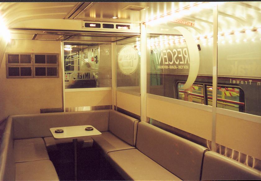Amtrak Amfleet Series II Lounge car (the Chicago?) interior of the Smoker section used on many single level long distance trains. This was Amtraks solution when the Dorm Lounge conversions from the 10&6 sleepers failed to make a good smoker lounge. Each Amfleet II Lounge that has been rebuilt like this is named after its own city and decorated accordingly. They also have TV monitors, but only a few have the GPS system installed and working to see where you are along the route. 2000