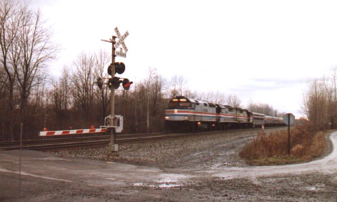 Seen in this photo by Brendan Kelly is an Amtrak train (I think it is the Maple Leaf) with an F40 (number unknown) and 2 GP40TCs (I am guessing the first is 192 and behind that is 193) with a Viewliner being shuttled from Buffalo to NYC?? through Pump Road crossing A common site to see on this train for the time while the Viewliners were being shipped to Amtrak.