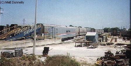 Amtrak's Auto Train Yard in Sanford Fl, 1989. The Auto Racks look great, and a dome is visible to the right. When this pic was taken, Amtrak was still using the "pooches" for motivepower. I was suprised at how well the picture came out, because I took this from the Silver Meteor's diner window while we were aproaching the Sanford station.