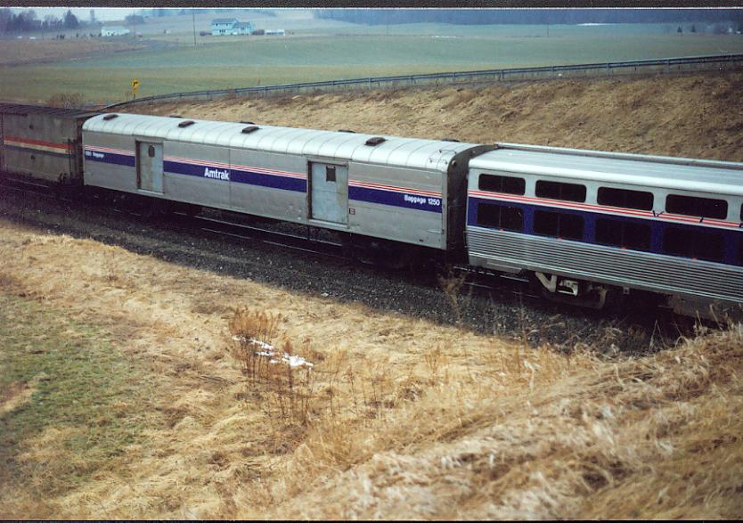 Baggage 1250 Amtrak Heritage baggage car #1250 in Phase IV paint on the Boston section of the Lake Shore Ltd. seen in Weedsport, NY, 1999.