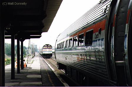 On the right is an Amfleet Coach heading up the tail end of the Empire State Express as the late Lake Shore Ltd 48/448, w/ F40 203 lead, waits to pull into the station. 1996ish
