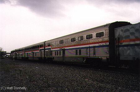 Four ex-Santa Fe HiLevel cars (2 coach dorms, and 2 coachs) on the rear of the Lake Shore Ltd. #48/448 in Syracuse, NY on their way to be scrapped.