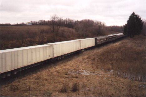 Three RailRoaders bring up the tail section of the Lake Shore Ltd seen from the Oakland Street Bridge near Weedsport, NY. 2/98