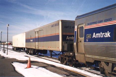 A Phase IV RailRoader (AMTZ 410025) and a White RailRoader on the rear of the Lake Shore 2/1/98.