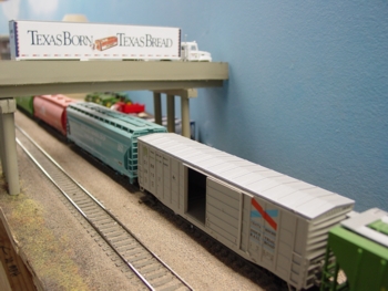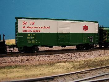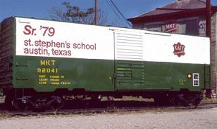 | The prototype MKT 92041 - Customized by the 1979 class of St. Stephens School, Austin, Texas. Trains - May 1979 issue: "Nationwide graduation greeting: Instead of painting on railroad overpasses, senior class of this Texas high school painted a box car, with Katy's blessing. Roaming in routine revenue service, anyone spotting it is asked to contact St. Stephens School." | MKT 92041 in service on the Mesquite Belt Model by Mike G. Ellis |