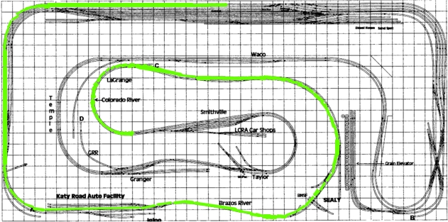 The Houston Sub represents double track trackage from Houston to South Smithville. It is in the middle and left hand side of the layout, highlighted in green.