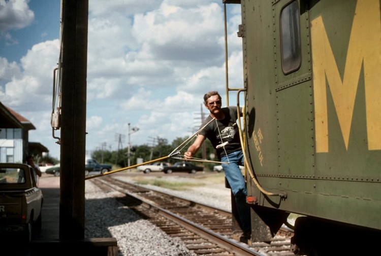 Picking up train orders at the depot after clearing Adams Street, while SB through Temple, September 1981