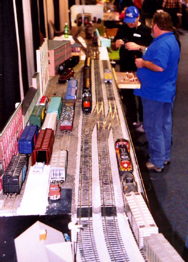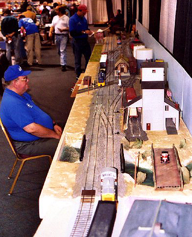 High level view of George Muller's 24' module set. Larry Grant (seated) is operating the train right in front of him, pulling it out of the yard on it way to the other half of the layout. This was taken from standing above the inside corner, as described above.