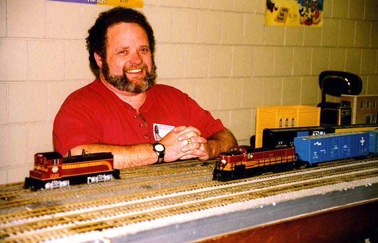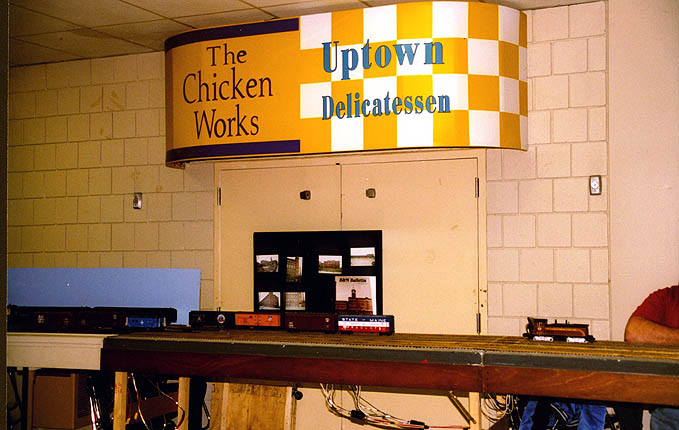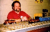 Most of the running was done with Dave Taylor's Red Caboose GP units, Weaver RS3, and Atlas SW9, all painted in Boston and Maine colors. Bill Wheeler brought his usual assortment of NH power, displayed on his engine terminal modules. Mike Boucher brought an On3 shay, and On3 D&RGW K-28 and his Bachmann On30 passenger car set. The narrow gauge engines were running back and forth on temporary track on Mike's two modules.