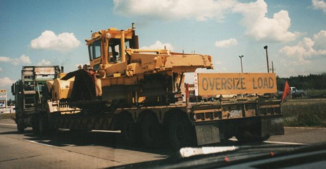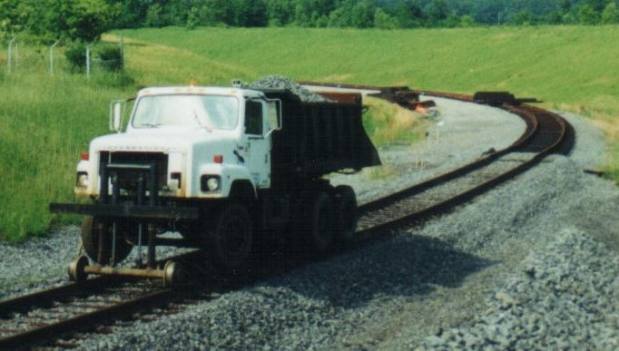 Railroad construction dump truck with Hi-Rail wheels at construction site of rail line extension to new salt mine;