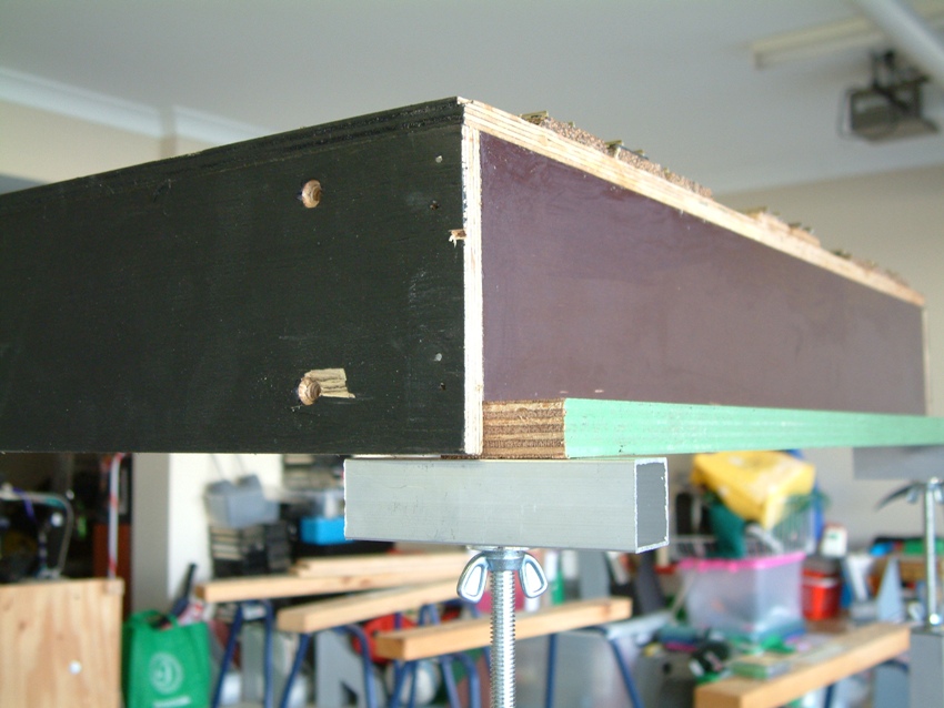 We modified the frame design to incorporate a "lapjoint" on one end, and a slot cut out on the other end. The ends have been retrofitted using Form Plywood. The form plywood is an Australian hardwood ply that is laminated. The ply being laminated eliminated modules needing paint on ends, and eliminated modules sticking and binding together. The single leg at each end with steel sleeve design was dropped in favour of a new free standing leg design. the new legs can be folded away, have adjustable glides on the base, and 200mm height adjustment at the top. effectively, when setting up the modules now, legs are unfolded and setup in minutes. the modules rest on top of the legs, where a stud in the leg seats into a notch at each corner of the module lap joint. The result is very sturdy and much easier to align. Modules are clamped together and aligned with a spirit level. |