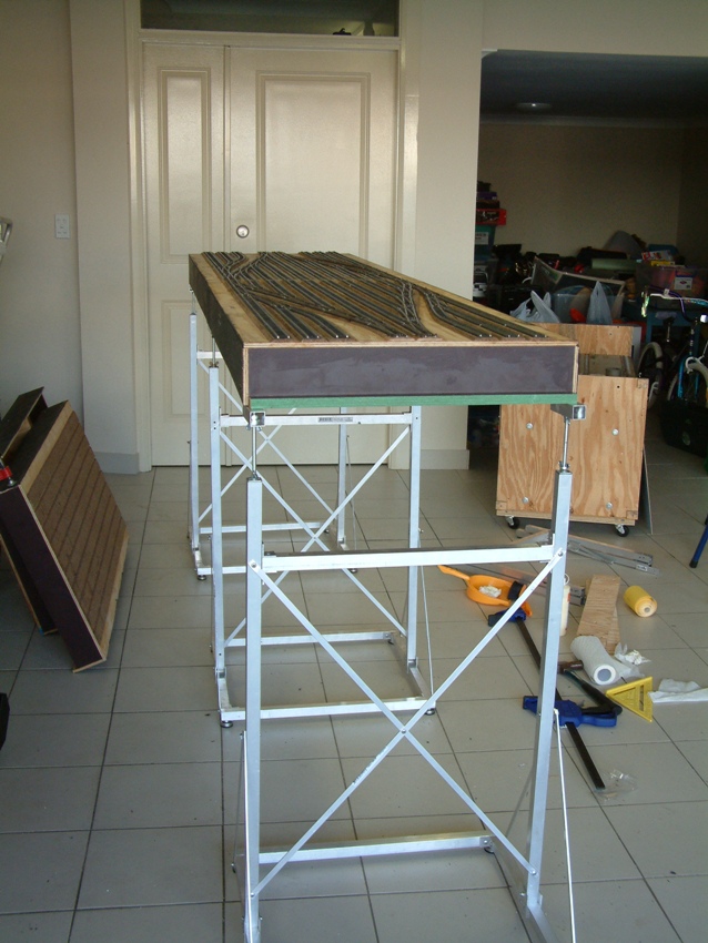 Our original standards for straight modules includes a sturdy plywood frame. The sides are 9mmx100mmx1200mm plywood, the ends and centre sections are 19mmx580mmx100mm, per diagram below. This design, though sturdy made life a bit difficult when joining modules together. Our problem was a large amount of time was being spent aligning modules. ![]() So, our members did some brain storming after observing how other clubs setup their layouts at our August 2008 Bligh Park Exhibition. We came up with ideas for new leg design, and module end design. The end result expected to reduce setup time of the entire layout to less than an hour.