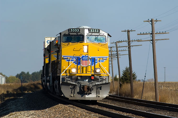 Things quickly improved, though, as I caught this rare clean UP engine leading a westbound stack train near Kinsman.