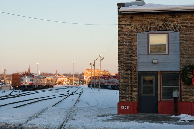 As the afternoon turns to dusk, the Advisory Board train idles in the "coach yard" near the 1905-vintage roundhouse.
