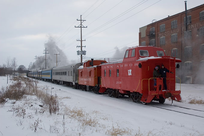 The handsome train consisted of the locomotive, five coaches, a concessions car and two cabooses.
