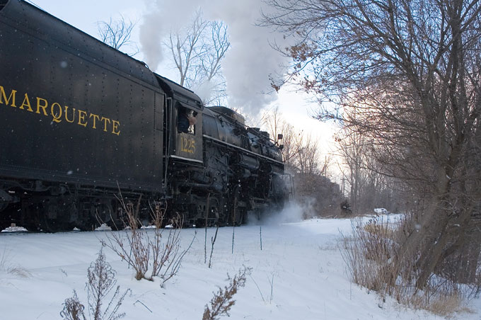 The engineer keeps a watchful eye on the locomotive as he guides it north toward Chesaning.