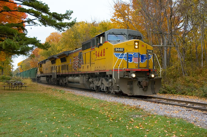 A friendly wave from the engineer as the train rumbles through Devil's Lake State Park.