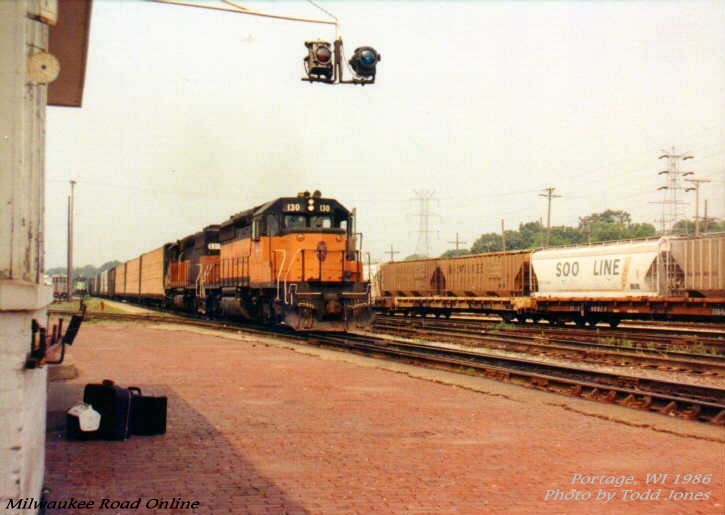 painted SD40-2 #130 leads an eastbound into Portage WI for a crew change