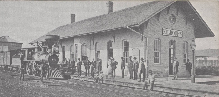 THE ARRIVAL OF A TRAIN was a major event, as when this wood-burning 4-4-0 was at Kilbourn, Wis., in 1875. Kilbourn now is known as the Wisconsin Dells.