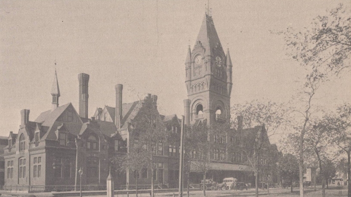 THE MILWAUKEE STATION, huge, ornate, with stately tower is shown as it looked in 1887, the year after it was opened. It was remodeled in 1943 and in 1953 before being torn down in 1966, after the opening of a new station in 1965.