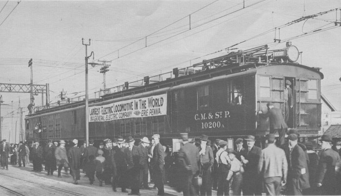 The Milwaukee Road’s first electric freight locomotive, No. 10200 AB, shown on display in Butte, Mont., during October 1915. On Nov. 30, 1915, No. 10200 powered the first train to run under the Milwaukee mainline catenary, from Three Forks, Mont., to Deer Lodge, Mont., a distance of 112 miles.
