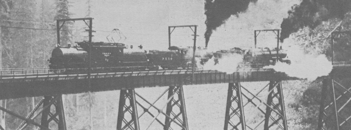 One of the most famous exploits of the Milwaukee bi-polars were “tugs-of-war” staged to show the tremendous tractive effort and regenerative braking powers of these electric locomotives. The test shown here was conducted on one of the high bridges in Snoqualmie Pass on the railroad’s Coast Division - about 1925.