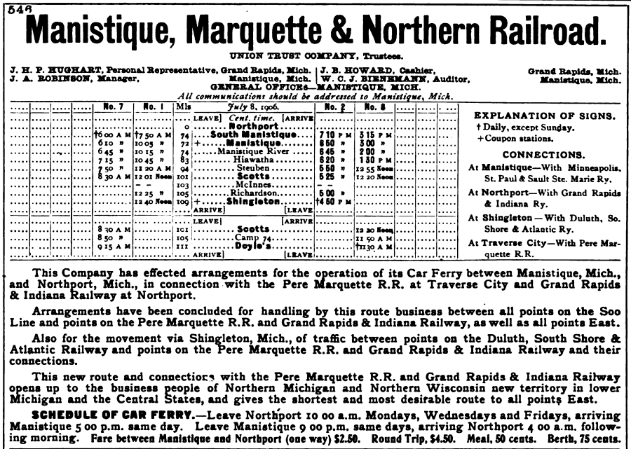 The Taverse City, Leelanau & Manistique Railroad and Manistique, Marquette & Northern Railroad companys where both controlled by Grand Rapids & Indiana Railroad interests, to gain more traffic for the GR&I through the railroad car ferry operations, the car ferry operation was a major money losser in this case. History of Traverse City, Leelanau & Manistique Railroad 1912 Map of Traverse City, Leelanau & Manistique RR from Traverse City to Northport Map of Traverse City, Leelanau & Manistique RR Traverse City connection based on 1902 maps |