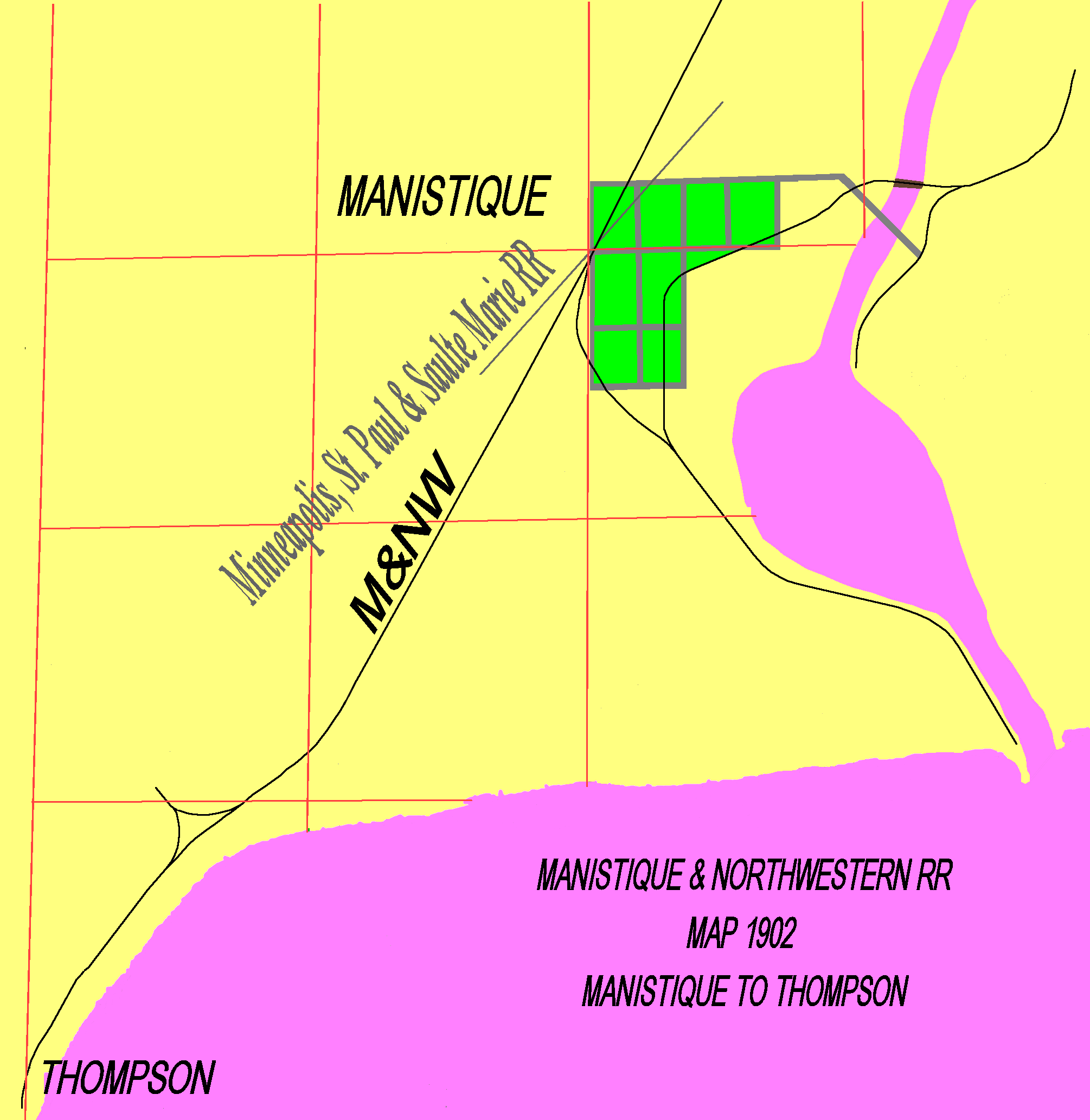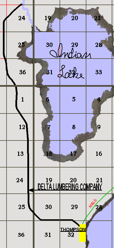 THOMPSON, MICHIGAN The Delta Lumbering Company, as shown on the map, the reason the Manistique & Northwest Railway went to Thompson. With all the lumber to be be shipped, going by boat. Is probably the reason to go there but this may not be the main reason. The map is a redraw from a 1898 Michigan Railroad Commissioner drawing done by the railroad for a change in route. The original map was almost not readable in many parts, it was done on a paper which looked like waxed paper and drawn in ink, which had faded and was water damaged. A 1902 change of route drawings still shows the connecting line from South Manistique to Thompson. For additional information goto Thompson Township web site - story and pictures. |