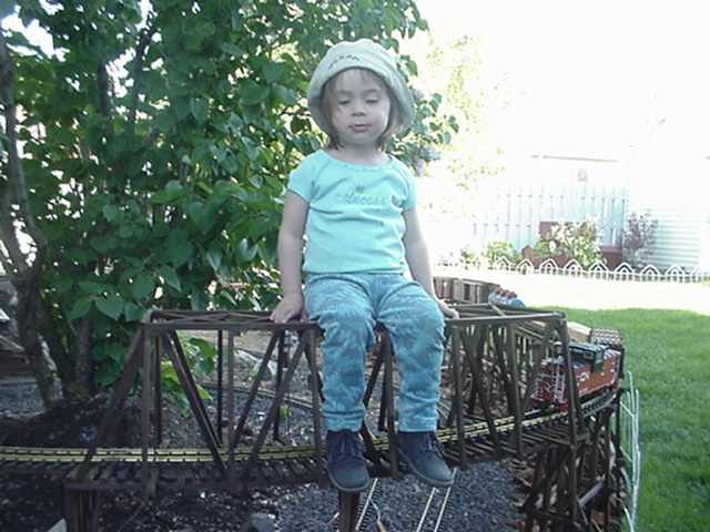 Voici une photo de ma fille (30 lbs) assise sur le pont en courbe. Elle est assise sur son côté extérieur. Pourquoi un pont en courbe? D'abord pour le défi. Plusieurs diront que ce ne fut pas une pratique applicable aux trains réels. Peut-être. Selon moi, les véritables trains n'ont qu'une seule logique: relevé, par tous les moyens, les défis auxquels ils font face. Et je crois qu'un chemin de fer, aussi miniature soit-il, doit aussi procéder de la sorte. Dans ce cas, un pont courbé était la solution. |