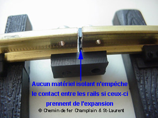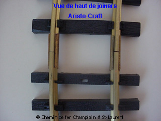 Sur la photo, on voit les joiners isolant d'Aristo-Craft. Ils ont un gros désavantage: ils ne se vissent pas. On voit bien sur la photo les trous pour les vis qui arrivent plus haut que le joiner. Pour cette raison, je recommande plutôt l'utilisation de rail clamps en plastique. Les joiners isolateurs en plastique doivent tous avoir une membrane entre le bout des rails. Cette membrane empêche les rails de se toucher lors de l'expansion de ceux-ci.