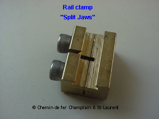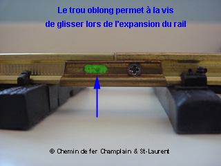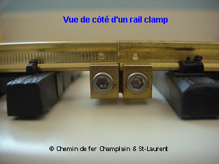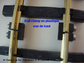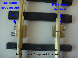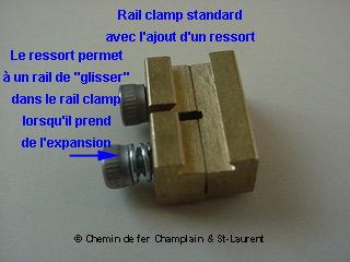 Les rail clamps ont l'inconvénient de leur avantage: ils tiennent les rails trop solidement en place. Si le rail ne peut prendre de l'expansion, il se tordera et l'écartement de 45 mm sera faussé. Il se vend des rail clamps spéciaux pour l'expansion. Ceux illustrés ici sont fait par moi-même. J'ai acheté des petits ressorts que j'ai coupés. Puis j'ai inséré ces ressorts dans une vis du rail clamp. Le rail clamps maintient toujours le rail en place, mais il permet à ce dernier de glisser et de prendre de l'expansion.