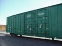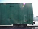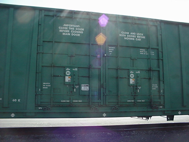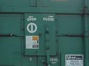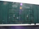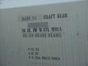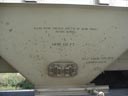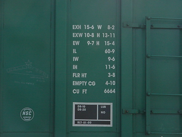 Les dimensions montrées sur ce côté sont celles des dimensions internes du wagon. On rencontre rarement ces écritures, mais c'est une façon de faire de la publicité auprès de potentiel client. Le carré noir au bas est la plaque de maintenance. Cette plate comprends, entre autre: l'année et le mois de fabrication (BLT, pour Built), l'année de reconstruction (s'il y a lieu) ainsi que les différents types de maintenance majeure effectués. Le logo NSC signifie "National Steel Car", le constructeur du wagon. The dimensions showns on this end are the internals dimension. They are not mandatory, but it's a good publicity for potential customers. The black square at the bottom is the maintenance plate. The plate shows: the year and month of built (BLT), the year and month of rebuilt (if apply) and different types of major maintenance. NSC stands for National Steel Car, the builder of the car. |