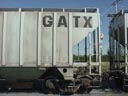 Lettres d'appellation du wagon. Dans ce cas-ci, la compagnie "General American Transportation" utilise aussi ces letres comme logo. (photo prise sur un autre wagon) Reporting marks of the car. In the case, the company "General American Transportation" use those also as a logo. (Picture took on an other car) |