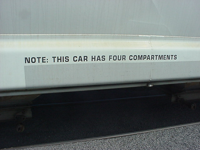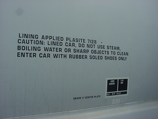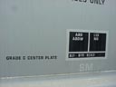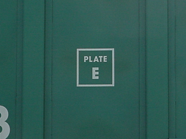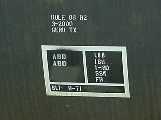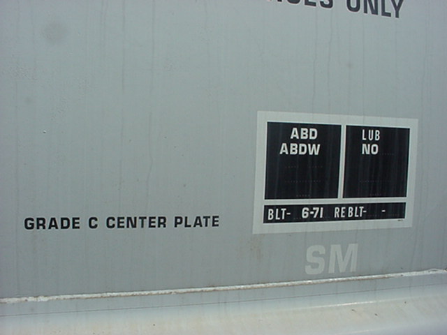 Le carré noir au bas est la plaque de maintenance. Cette plate comprends, entre autre: l'année et le mois de fabrication (BLT, pour Built), l'année de reconstruction (s'il y a lieu) ainsi que les différents types de maintenance majeure effectués. "Grade C center plate" fait référence à la "plate" du wagon. The black square at the bottom is the maintenance plate. The plate shows: the year and month of built (BLT), the year and month of rebuilt (if apply) and different types of major maintenance. "Grade C center plate" refer to the "plate" of the car. |