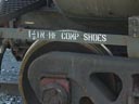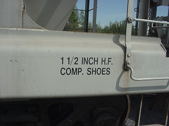 Au bas du wagon, on peut lire "1 1/2 inch HF Comp Shoe". C'est le type de sabot de frein utilisé. "1 1/2 inch" signifie que les semelles de frein ont 1 1/2 pouces de largeur. "HF Comp" signifie Composition, le nom du matériel utilisé pour la confection de la semelle. Une autre sorte peut être Sindered Iron (SP). (photo prise sur un autre wagon) At the bottom of the car, we can read "1 1/2 inch HP comp shoe". This refer to the brake pad used on the car. 2 inch means that the brake pads are 1 1/2 inches wide. "HP Comp" is the name of the material used in the pad. In this case, Composition material. It can also be Sindered Iron (SP). (Picture took on an other car) |