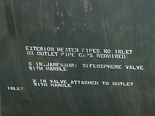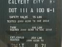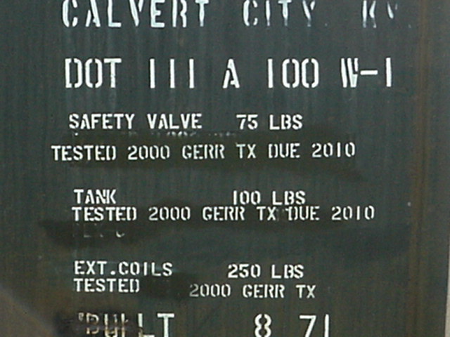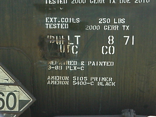 Cette section présente sur la plupart des wagons-citerne. "DOT" signifie "Department of Transportation" (Ministère du transport américain). "111 A 100 W-1" est la norme selon laquelle la citerne du wagon a été construite. Comme ces normes sont très très strictes, elles doivent figurées sur le wagon. Les autres écritures sont les tests auxquels ont été soumis les différentes composantes de la citerne, ainsi que la date à laquelle de nouveaux tests sont dû. This section is present on most of the tank cars. DOT stands for Department of Transportation (american federal transportation agency). "111 A 1000 W-1" shows the standard on which this car has been built. Such standard are very strict and they must appear on the car. Other inscriptions shows the different tests performed on safety device of the car and the date of the next tests. |