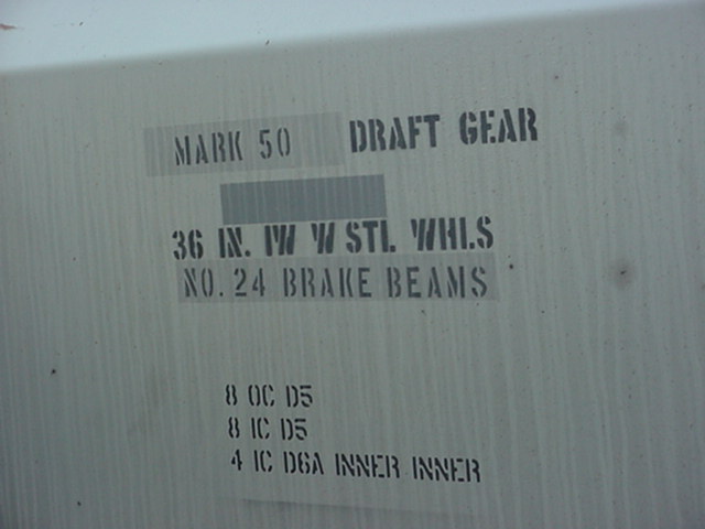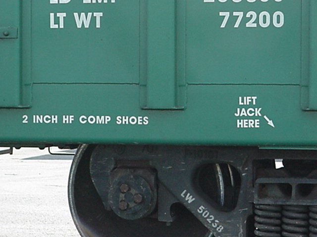 Au bas du wagon, on peut lire "2 inch HF Comp Shoe". C'est le type de sabot de frein utilisé. "2 inch" signifie que les semelles de frein ont 2 pouces de largeur. "HF Comp" signifie Composition, le nom du matériel utilisé pour la confection de la semelle. Une autre sorte peut être Sindered Iron (SP). À droite, on voit "Lift Jack Here". En cas de déraillement ou de maintenance, c'est là qu'il faut insérer le crochet de la grue qui lèvera le wagon (le trou fait face au sol sous le wagon) At the bottom of the car, we can read "2 inch HF comp shoe". This refer to the brake pad used on the car. 2 inch means that the brake pads are 2 inches wide. "HF Comp" is the name of the material used in the pad. In this case, Composition material. It can also be Sindered Iron (SP). Right, we see "Lift Jack Here". In case of deraillement or maintenance, the hook of the crane must insert in this hole (the hole si under the car body). |